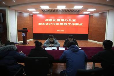 应校党委宣传部要求,信息化管理办公室全体教职员工于2019年2月26日上午10:00于四号实训楼四楼演播厅对2019年党政重点工作进行深入学习。