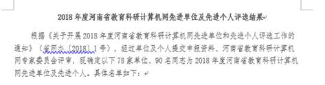 12月5日,2018年度河南省教育科研计算机网先进单位结果公布。我校荣获2018年度“河南省教育科研计算机网应用建设先进单位”称号。此次评审是为贯彻落实教育部及河南省教育信息化的发展规划,进一步总结推广我省高校信息化典型经验,提高河南省教育科研计算机网应用服务水平而开展的评选活动。