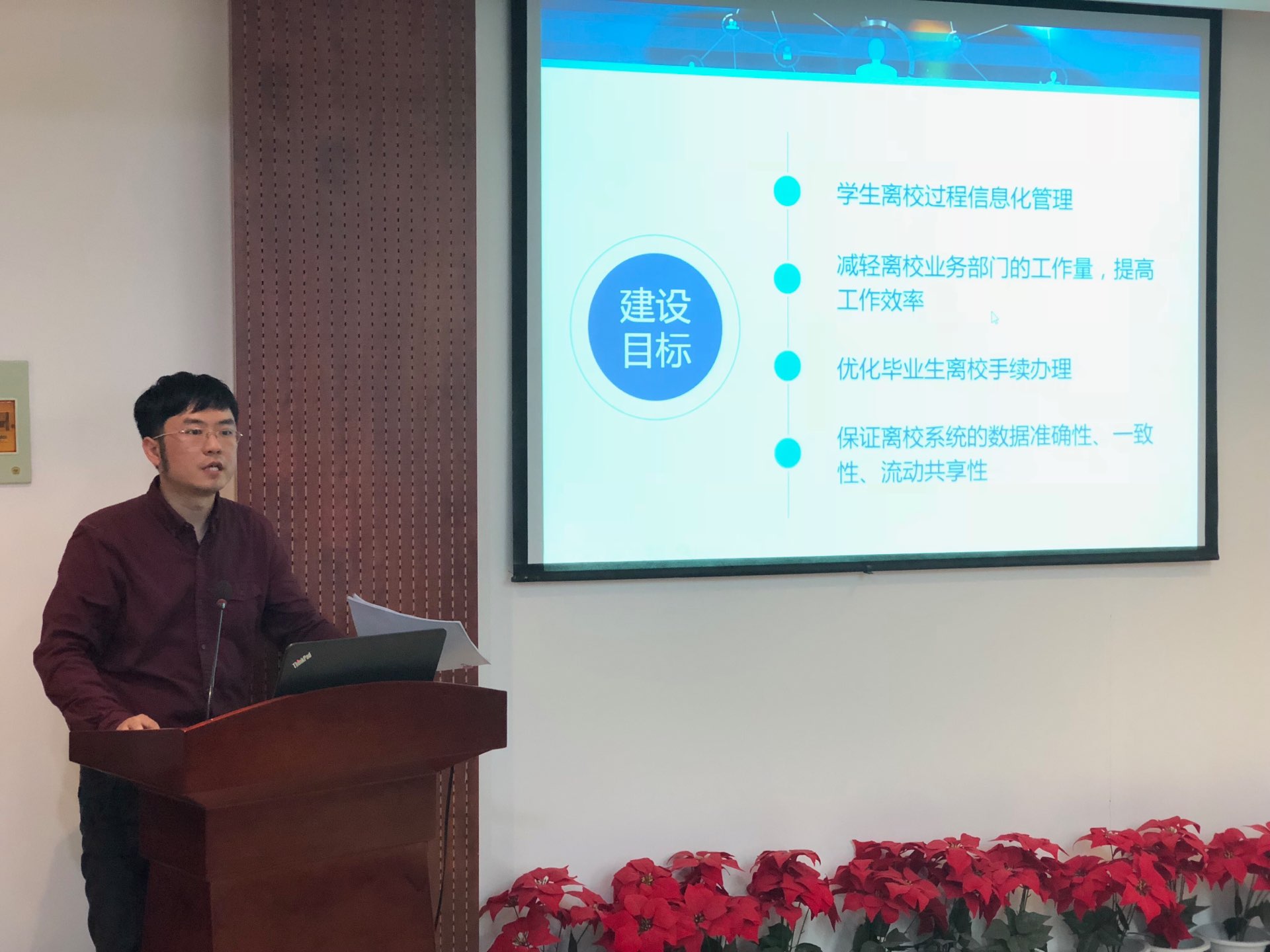会上数字化校园建设与管理办公室主任李响就离校与迎新系统具体实施方案进行了解读,对方案中建设目标、项目部署、技术参数等方面做出了详细说明。