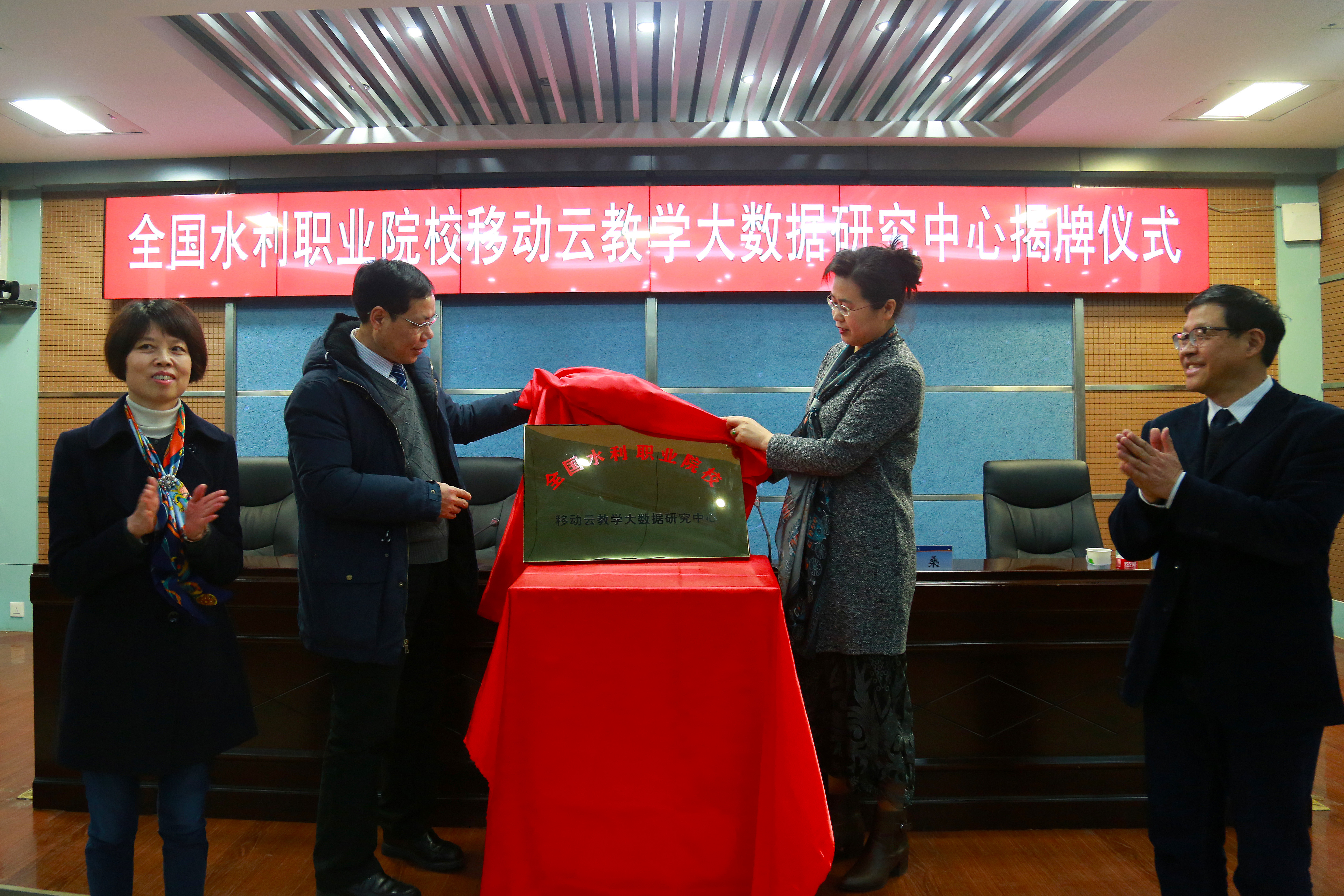 副校长焦爱萍与商院长分别代表双方共同进行签约。签约结束后,党委书记许琰、党委副书记王卫东、副校长焦爱萍和商院长共同为全国水利职业院校移动云教学大数据研究中心揭牌。