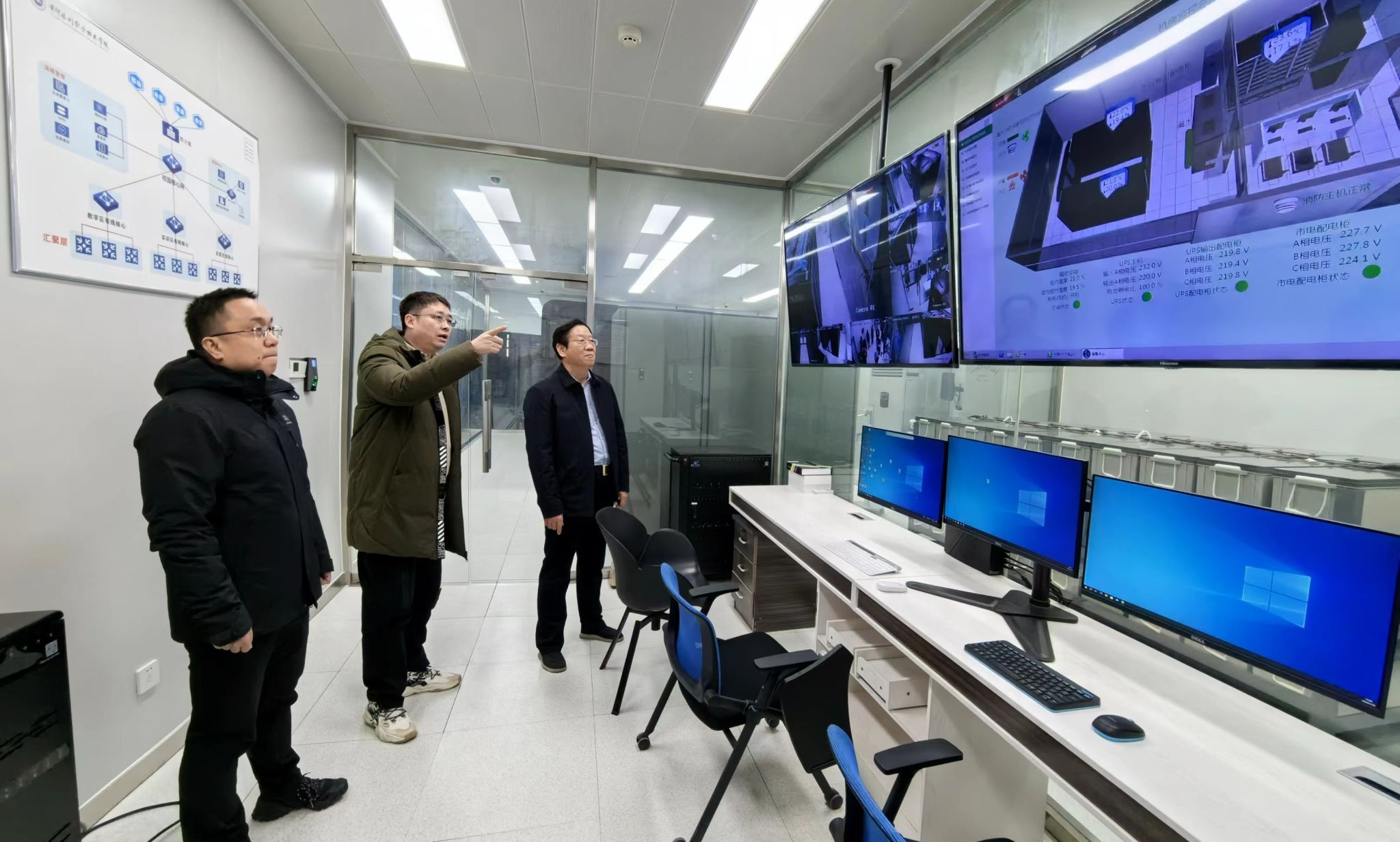 在开展排查工作前,副校长刘守义来到信息化管理办公室部署本次安全检查工作,并实地检查了智慧校园服务大厅和学校信息中心机房,并对大厅场所和信息化设备的运行安全提出了意见和建议,要求切实增强政治敏锐性和政治责任感,坚定政治自觉、思想自觉和行动自觉,切实把安全工作抓在手中、扛在肩上、落到实处,坚决维护广大师生生命财产安全和社会大局稳定。