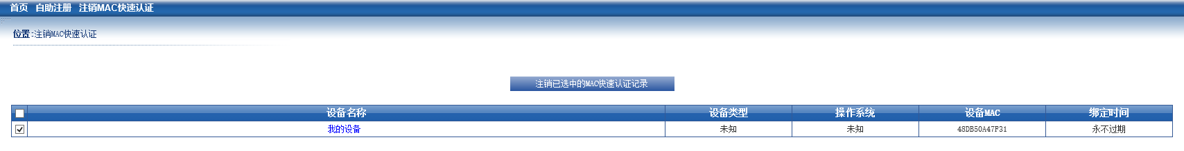 点击左上角“注销MAC快速认证”菜单,勾选“我的设备”,点击“注销已选中的MAC快速认证记录”即可。