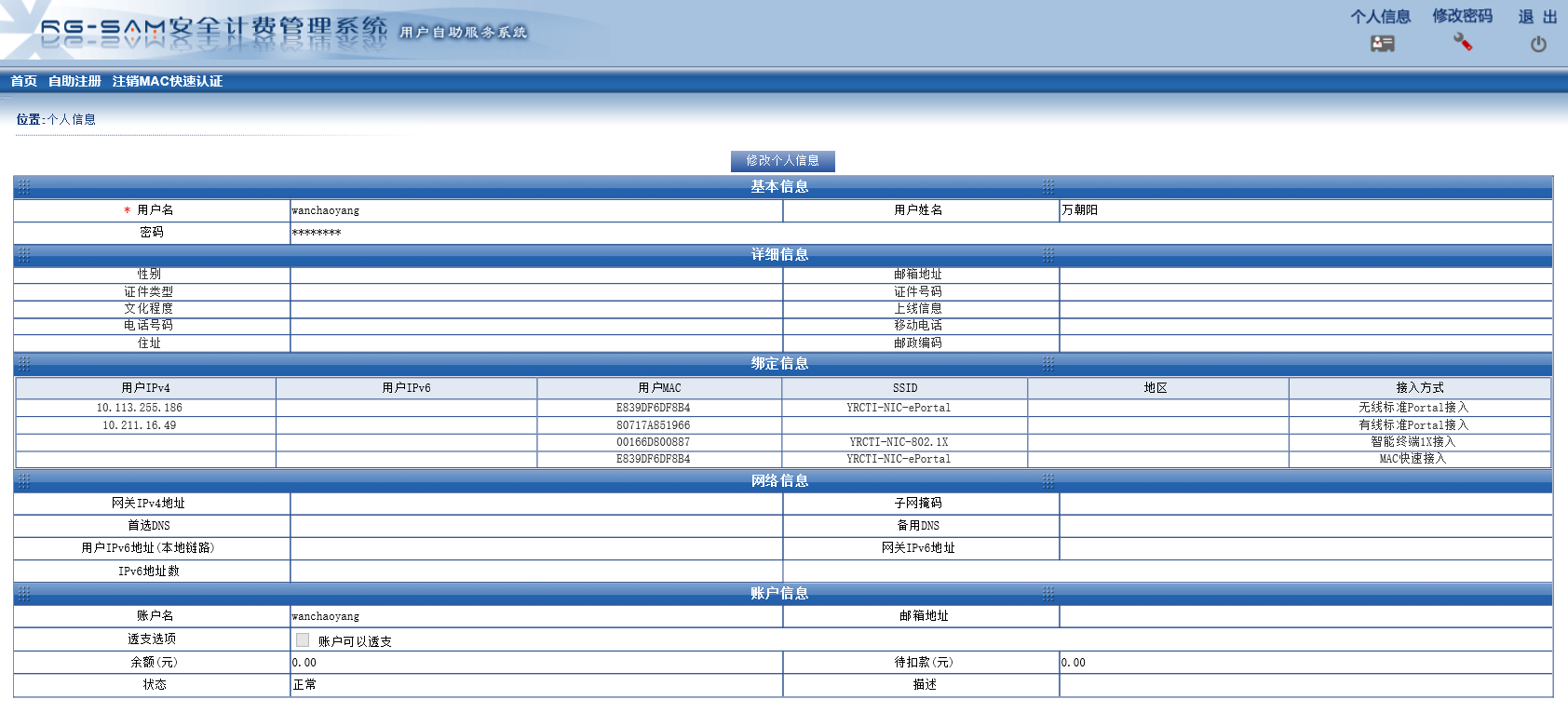 使用自己的无线账号登录进入系统,界面如图所示: