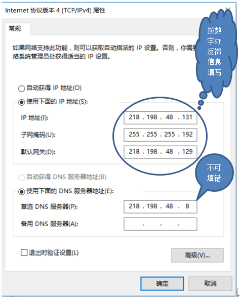 注意:锐捷认证系统登录窗口中的用户名和密码、internet协议版本4(TCP/IPv4)窗口中的IP地址、子网掩码、网关及DNS地址由数字办给出的反馈信息中提供,不要随意更改,同时注意存档备查。一般认证失败时用户可以自己核对上述信息是否正确,如果上述信息丢失,可致电数字办查询。