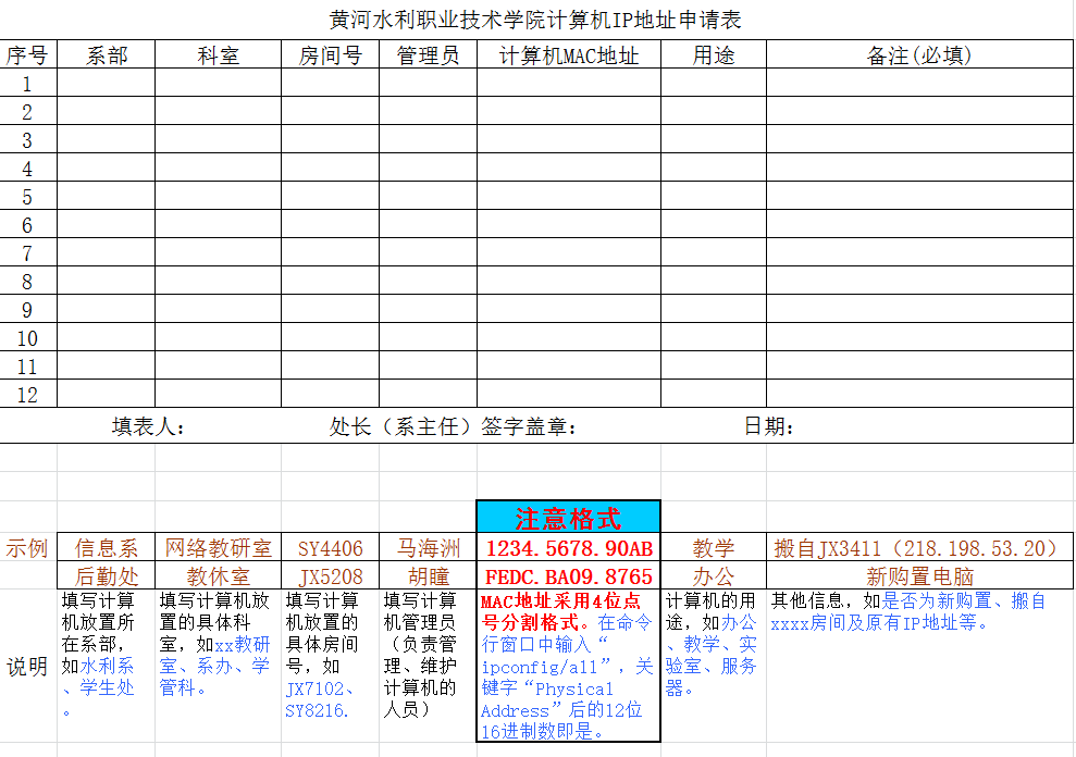 打开数字办主页http://szb.yrcti.edu.cn,在右侧“资料下载”栏目中下载《黄河水利职业技术学院计算机IP地址申请表》,用户自行打印申请表进行填写并请部门领导签字,加盖部门公章后将纸质稿送至数字办网络信息中心办公室(4号实训楼4408B)并将电子稿发送至办公自动化进行办理申请。待账号分配完毕后请至办公自动化查收。