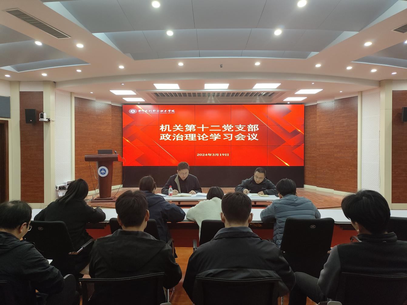 为深入学习贯彻习近平新时代中国特色社会主义思想和党的二十大精神,落实学校切实加强党员、干部教育培训工作要求,3月19日下午,机关党总支第十二支部在四号实训楼四楼演播厅召开政治理论学习会议。会议由信息化管理办公室主任曾赟主持,全体党员同志参加。