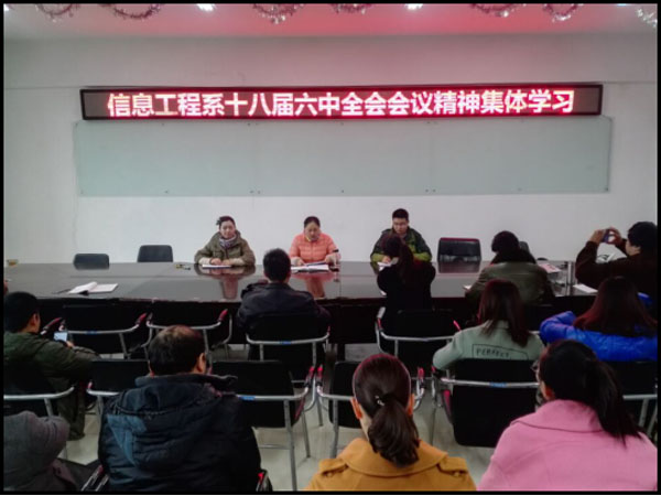 按照校党委总精神,2016年11月1日下午,信息工程系党总支在系会议室组织全系教职工学习党的十八届六中全会精神,会议由系党总支书记丁爱萍主持。