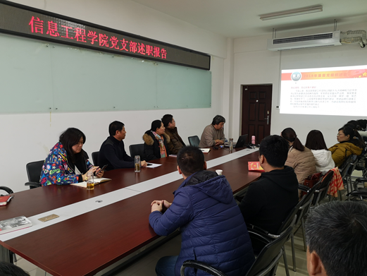 2018年12月25日下午,信息工程学院在SX5508会议室召开2018年度党建工作述职报告会,出席本次会议的有:信息工程学院党支部书记罗朝峰、院长丁爱萍、副书记李晓娟,副院长曾赟,学院党员教职工以及学生代表。