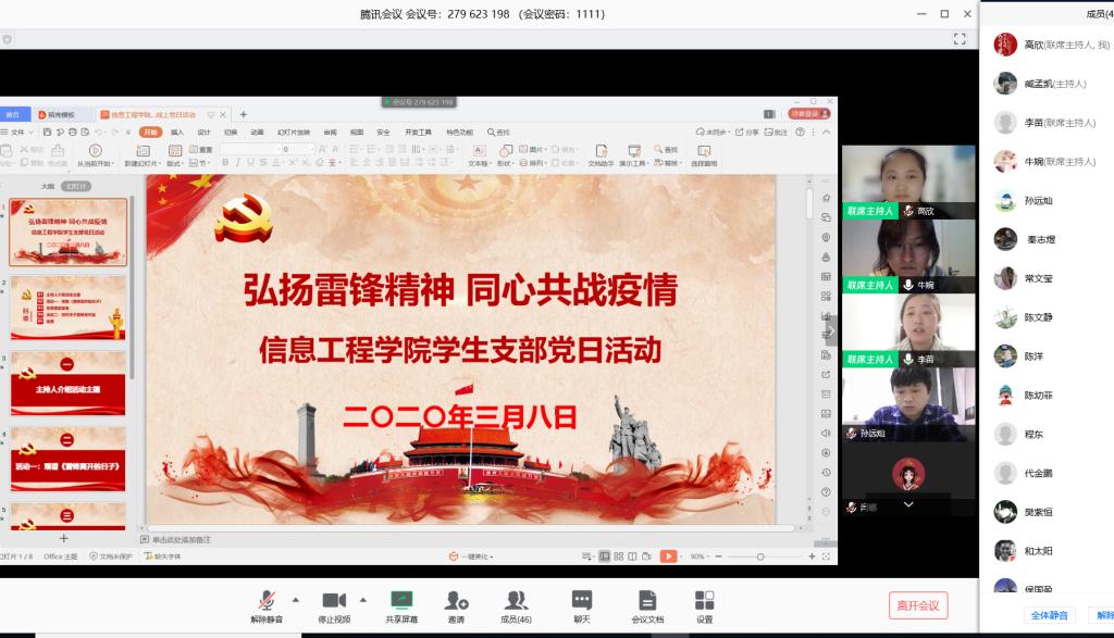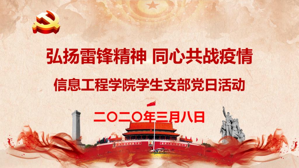 为更好的深入学习习近平总书记关于疫情防控工作的重要讲话精神,贯彻学校党委关于疫情防控工作的决策部署,坚定打赢疫情防控阻击战的决心和信心。信息工程学院3月8日开展了“弘扬雷锋精神,同心共战疫情”党日活动,本次活动由学生支部书记高欣主持,组织委员李苗、宣传委员牛婉、全体辅导员以及全体学生党员参会。