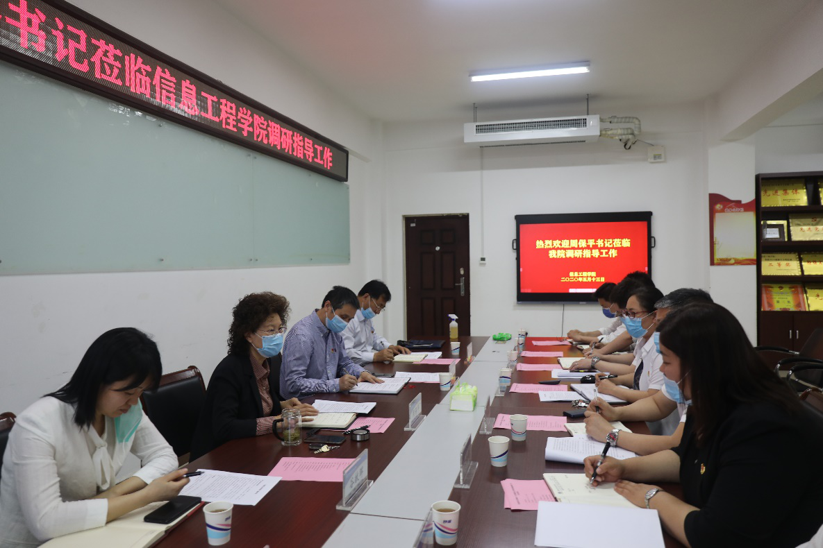 5月13日下午,校党委书记周保平到信息工程学院调研指导工作,党政办公室、组织部、宣传部、信息化管理办公室等部门负责人随同参加调研。信息工程学院领导班子、科级以上干部参加了调研座谈。会议由党总支书记罗朝峰主持。