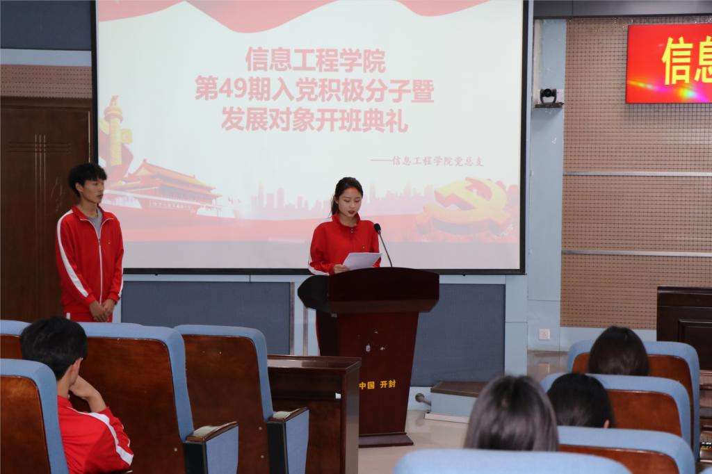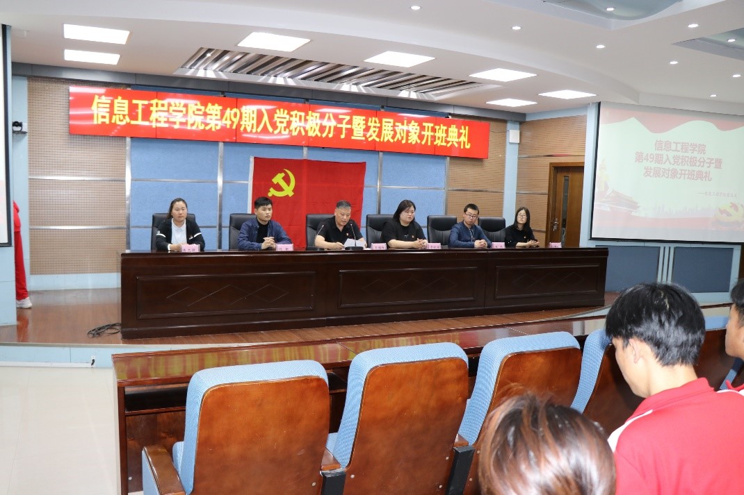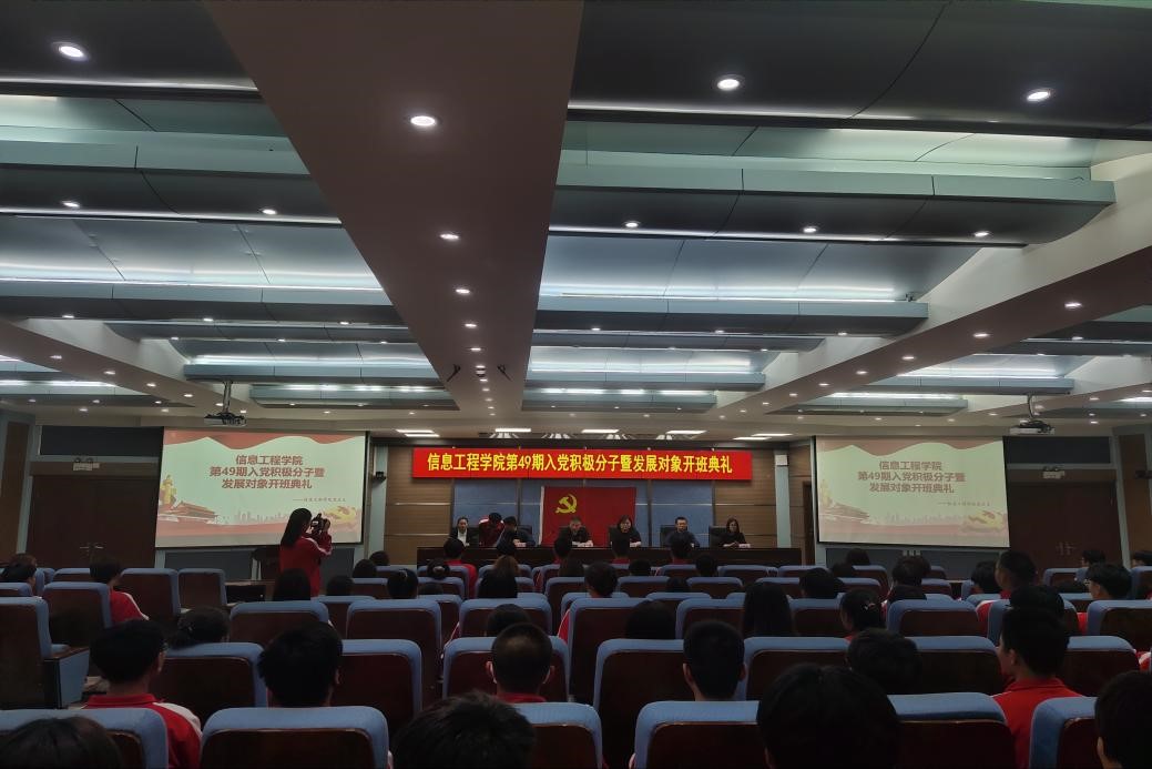 南湖微漾泛涟漪,峥嵘岁月百年行。一百年来,伟大的中国共产党矢志践行初心使命、筚路蓝缕奠基立业,取得了举世瞩目的伟大成就。为帮助青年学生了解中国共产党的发展奋斗史,坚定当代青年永远跟党走的理想信念,传承红色基因,在信息工程学院党总支的正确指导下,5月8日于水利报告厅举行了信息工程学院第49期积极分子暨发展对象开班典礼。大会由信息工程学院学生党支部书记何昕主持,信息工程学院党总支书记罗朝峰、信息工程学院党总支副书记李晓娟、19级辅导员陈文静、20级辅导员程凯、王琳琳和所有党校学员出席了本次活动。