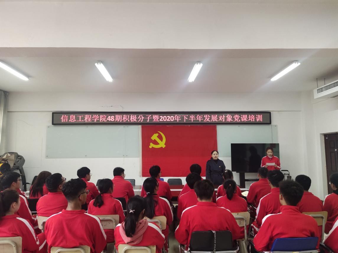 为端正党课培训班学员入党动机,加强对中国共产党的认识,信息工程学院于2020年11月16日在SY5508开展第48期积极分子暨2020下半年发展对象党课培训,此次培训由信息工程学院院长丁爱萍老师带领同学们学习。