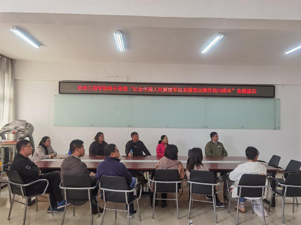 为纪念中国人民解放军抗美援朝出国作战70周年,铭记历史缅怀先烈,弘扬中华民族精神。10月23日上午,信息工程学院组织全体教职工集中观看“纪念中国人民解放军抗美援朝出国作战70周年”大会直播。