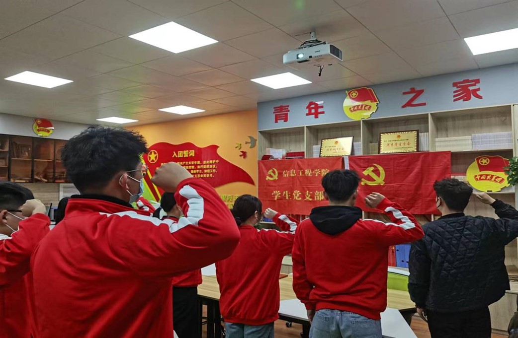 为进一步规范党员发展工作,提升党员的责任感,教育引导新发展党员铭记入党初心、强化党员意识、坚定理想信念,充分发挥先锋模范作用,信息工程学院学生党支部于2023年3月19日在SY4409B1以线上线下相结合的形式举行新发展党员入党宣誓仪式。信息工程学院全体党员及新发展党员参加,会议由学生党支部书记何昕主持。