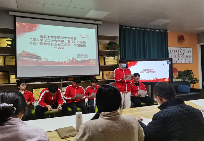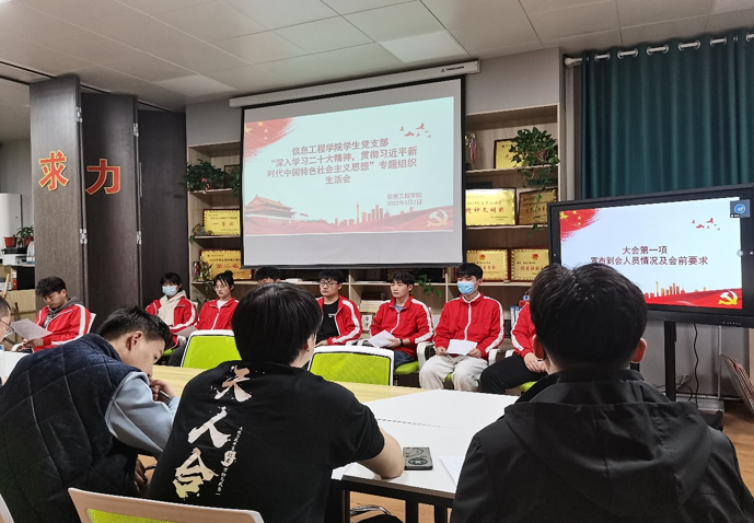 为深入学习贯彻党的二十大精神,坚持不懈用习近平新时代中国特色社会主义思想凝心铸魂,信息工程学院学生党支部于3月7日下午17:00以线上线下相结合的形式在SY4409B1开展“深入学习党的二十大精神,贯彻习近平新时代中国特色社会主义思想”专题组织生活会,本次会议由信息工程学院学生党支部书记何昕老师主持,支部全体党员参加。