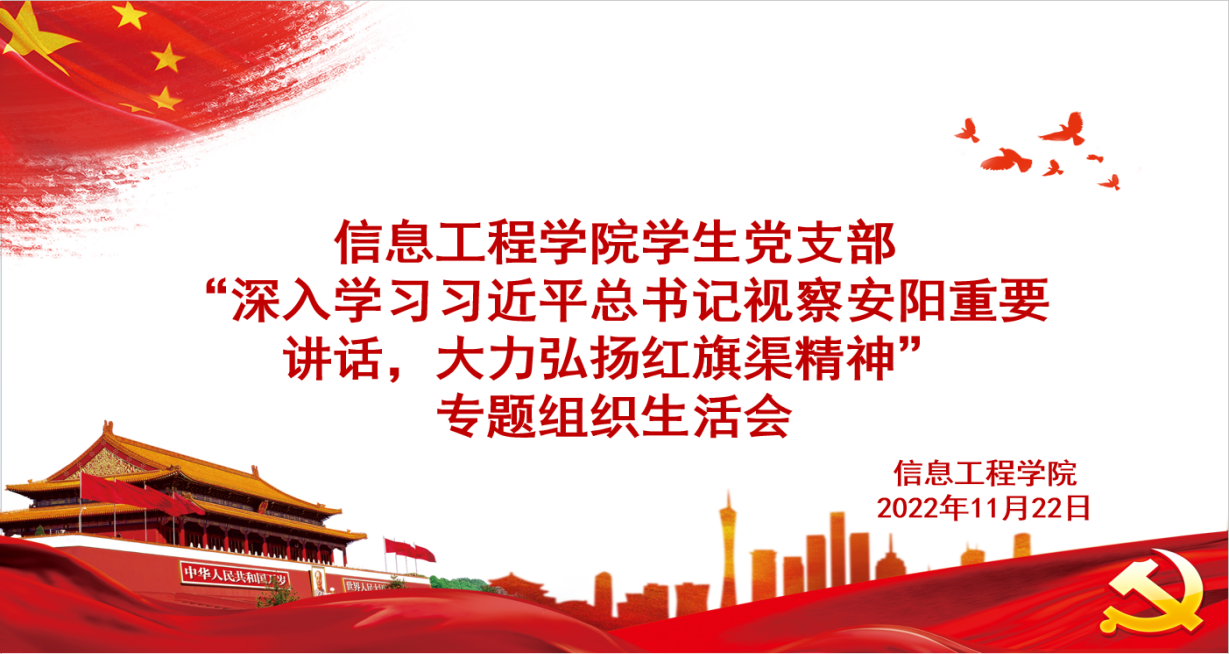 为了深刻领悟红旗渠艰苦卓绝的精神内涵,继承发扬自力更生、艰苦奋斗的优良传统,牢记为人民服务这一宗旨。信息工程学院学生党支部于2022年11月22日以线上线下相结合的形式在SY4409B1及腾讯会议召开“深入学习习近平总书记视察安阳重要讲话精神,大力弘扬红旗渠精神”专题组织生活会,会议由信息工程学院学生党支部书记何昕主持,支部全体党员参会。