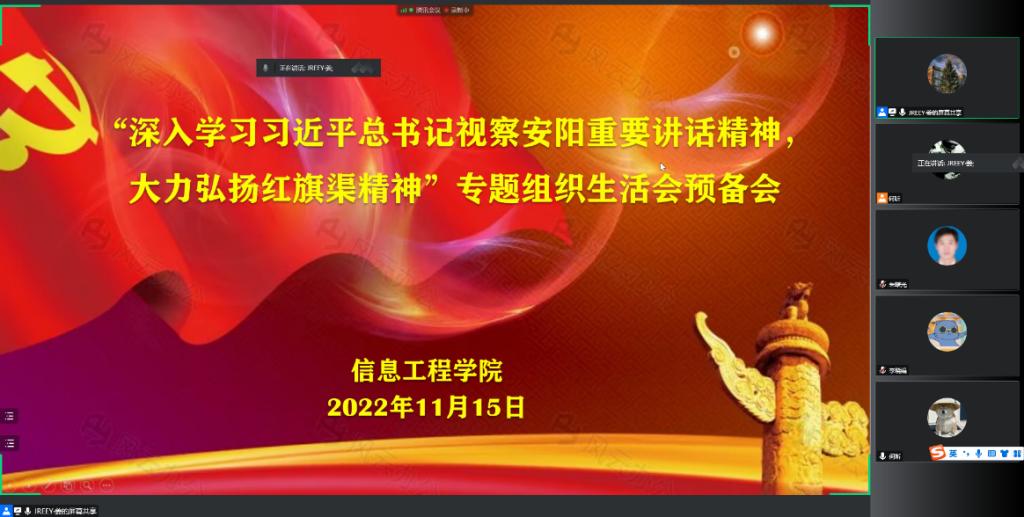 2022年11月15日下午,信息工程学院党总支在线上腾讯会议召开“深入学习习近平总书记视察安阳重要讲话精神,大力弘扬红旗渠精神”专题组织生活会预备会,会议由党总支书记罗朝峰主持。