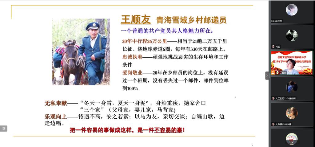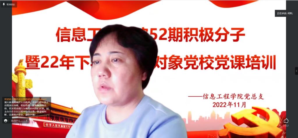 为了进一步加强党校学员对党的认识,端正学员们的入党动机,了解共产党的精神内涵及其先进性,信息工程学院于2022年11月14日以线上形式在腾讯会议开展第52期积极分子暨2022年下半年发展对象党校党课培训,会议由信息工程学院院长丁爱萍主讲,全体党校学员参会。
