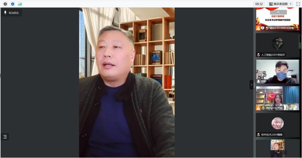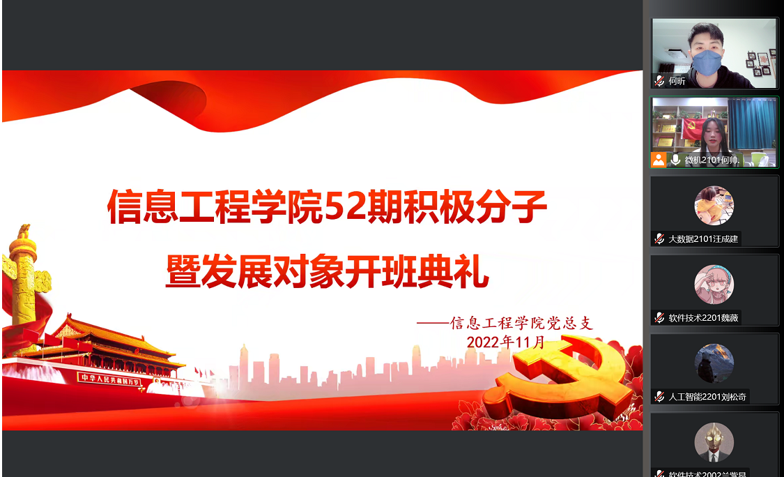 2022年 11月9日信息工程学院以线上的方式在腾讯会议举行第52期入党积极分子暨发展对象开班典礼,信息工程学院党总支书记罗朝峰、党总支副书记李晓娟、学生党支部书记何昕、信息工程学院全体辅导员及第52期全体入党积极分子及2022年下半年发展对象参会。