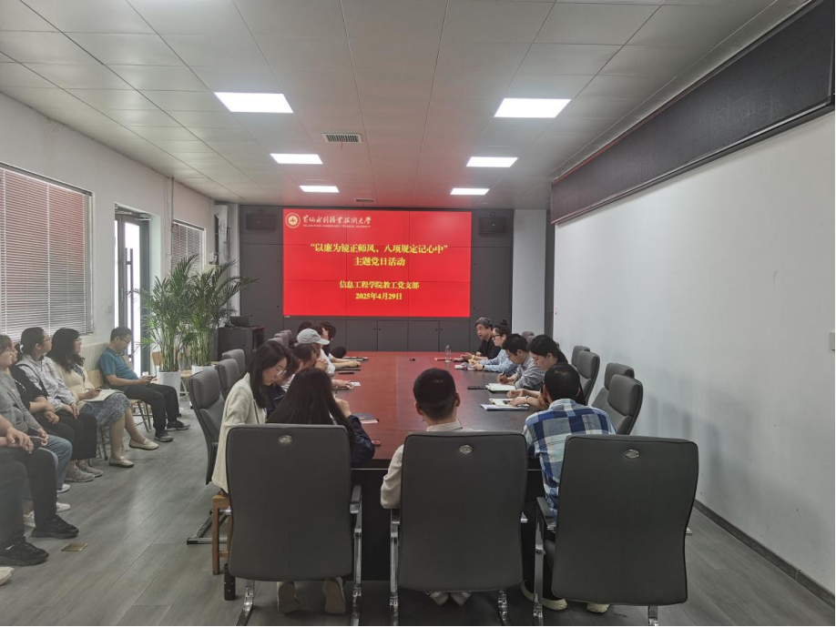 4月29日下午,信息工程学院在SY4426会议室组织召开“以廉为镜正师风 八项规定记心中”为主题党日活动。教工党支部组织员姜锐同志主持,信息工程学院全体教工党员参加。