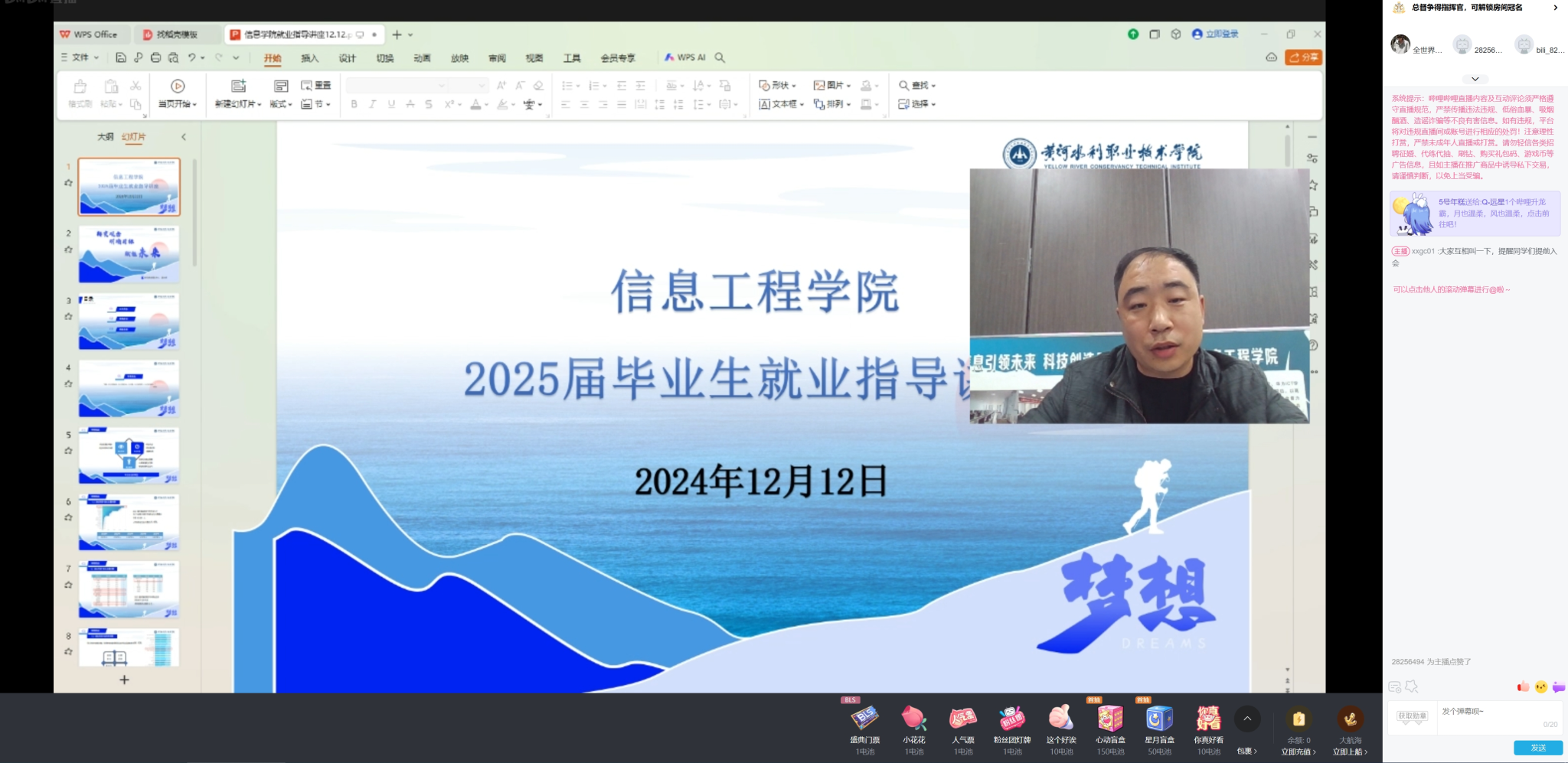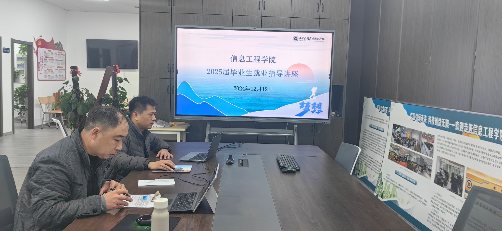 为帮助2025届毕业生顺利就业,提升学生就业竞争力,信息工程学院于2024年12月12日晚上7:00通过网络直播的形式开展就业指导讲座,本次讲座由院校企工作办公室负责人孙远灿老师主持,邀请我校就业指导教研室主任龚向哲老师作为主讲嘉宾。