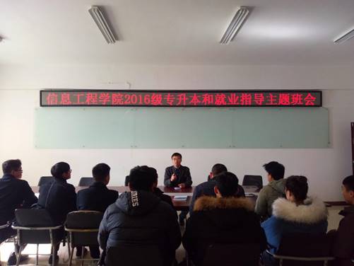 为进一步做好我院2016级学生就业指导工作,让同学们在毕业之前的这段时间做好相应的就业及专升本的规划,2018年11月22日信息工程学院在SX5508会议室召开2016级学生专升本与就业指导主题班会,参加会议是人员有:信息工程学院2016级辅导员贾红军老师和2016级部分学生代表。