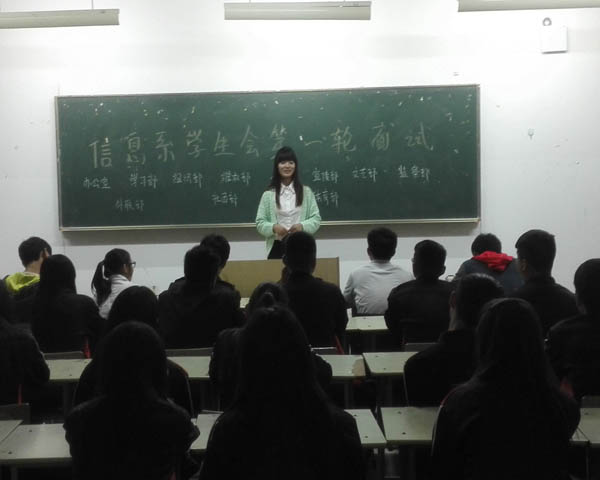会议伊始,主持人宣布面向学习部、宣传部、组织部、女工部、维权部、文艺部等部室招新开始。会上,每个同学都想通过系学生会这个平台来锻炼自己,展现自我,提高自我,他们慷慨激昂的演讲,理智冷静的思考,详谈自己的特长爱好及优势,畅谈学生会的看法。我系学生会负责人一直以来坚持“公平,公正,公开”和“择优录用”的优秀传统,在面试中对每一位同学都进行了认真,细致的考核。通过竞选演说,现场问答等多种方式进行选拔。