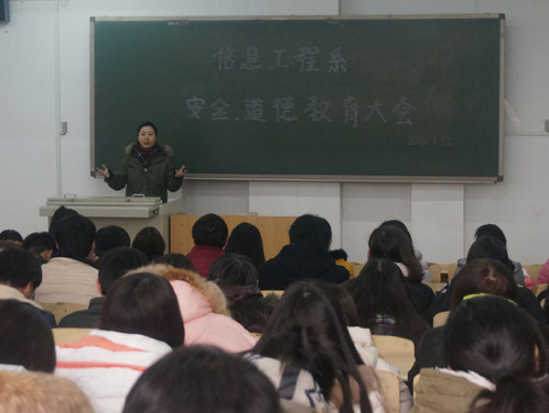 为加强同学们的安全和道德意识,督促学生做到端正态度、诚信考试,我系于1月12日13:00时,在jx2202教室召开2014级安全道德教育大会。会议由14级辅导员张瑞青主持,系副书记殷莺老师出席了此次大会。