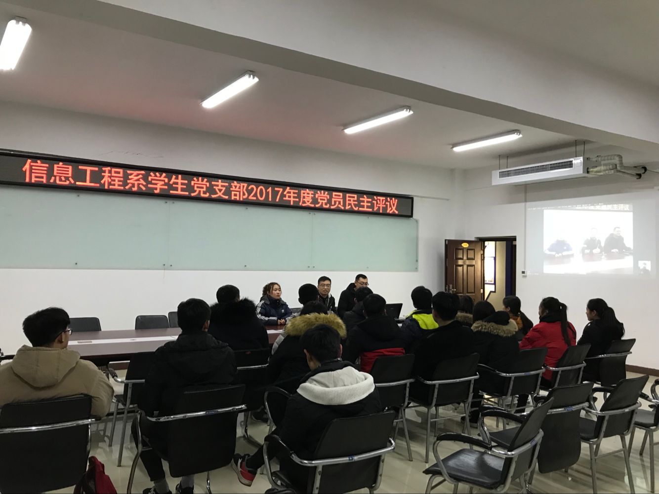 为了进一步在党内实行有效的民主监督,加强廉政建设,提高党员素质,发挥党员的先锋模范作用和党组织的核心作用。信息工程系学生党支部于2018年1月5日晚7点,在SX5508开展2017年度党员民主评议大会。参加本次会议的有:分团委书记彭战松、16级辅导员贾红军老师,以及系组织部部长车航月和入党积极分子。