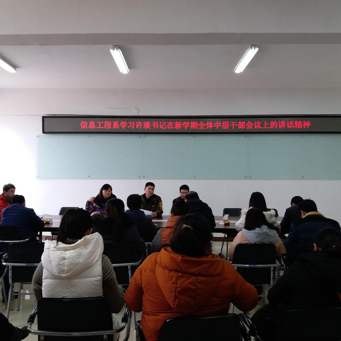 信息工程系于3月6日下午两点半在实训楼5508召开会议,集体组织学习许琰书记在新学期全体中层干部会议上的讲话。信息工程系党总支书记商坤、副主任吕振雷、副书记李晓娟和全体教职工参加了本次会议。