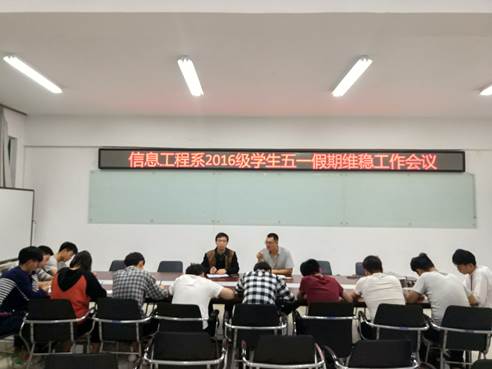 为了提高同学们的安全意识营造和谐的节日气氛,信息工程系于2018年4月28日在SX5508会议室召开2016级学生五一假期维稳工作会议。参加会议的有系学生党支部书记彭战松、16级辅导员贾红军,以及16级学生会骨干成员。