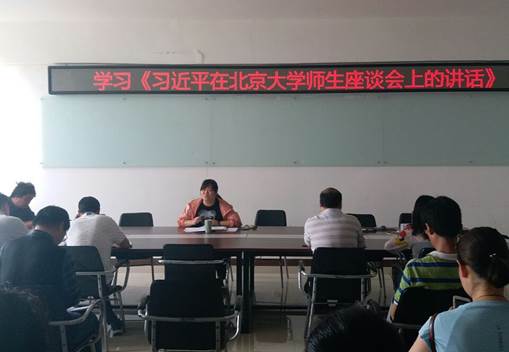 我系于2018年5月8日召开学习《习近平在北京大学师生座谈会上的讲话》精神,出席此次会议的是我系党总支副书记李晓娟老师,以及全体教职工。