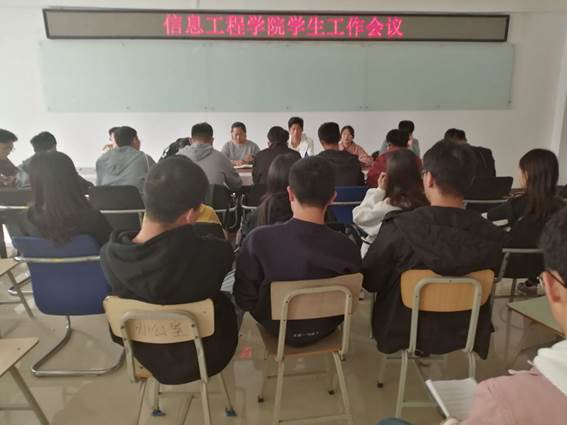 信息工程学院于10月28日12点在SY5508会议室召开了学生会工作会议,会议由分团委书记高欣老师主持,参加会议人员为学生会各部室负责人。会议伊始,高欣老师针对于宿舍卫生和安全问题做出了总结,要求其部室负责人针对于此问题的工作加强管理,提高工作效率,以较强的责任心把自己本职工作做好,提升学生个人素质。之后,各部室负责人对上周工作各自做了总结,以及对本周工作开展情况做了详细的汇报。高欣老师就上周的工作中各部室表现出的不足之处做出了指导和更正,也为今后的工作制订了明确目标和方向,推进了各部室学生工作的协调发展,要求学生干部带领同学们以更加积极态度严谨的作风,开展工作。