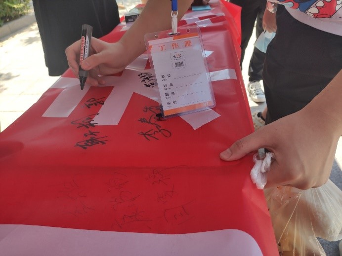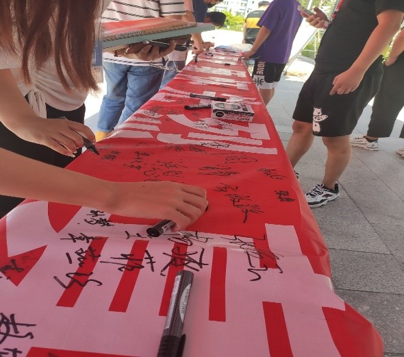 我院同学积极响应,纷纷拿起手中的笔在横幅上进行签字,为在抗战中牺牲的先烈进行缅怀。中国人民抗日战争的伟大胜利,重新确立了中国在世界上的大国地位,开启了中国凤凰涅槃、浴火重生的新征程。此次活动的开展有助于同学们铭记历史中砥砺民族复兴的坚强信念,弘扬以爱国主义为核心的伟大民族精神。