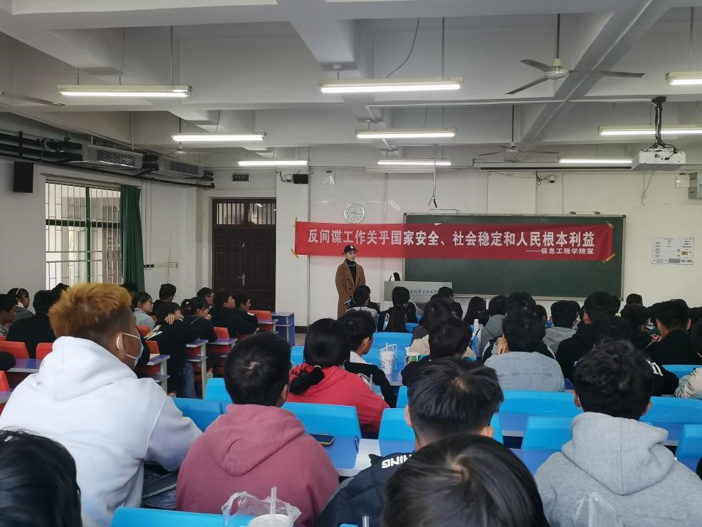 11月11日中午,信息工程学院大一大二辅导员在JX2302/2301/2502组织学生开展《中华人民共和国反间谍法》宣传教育。