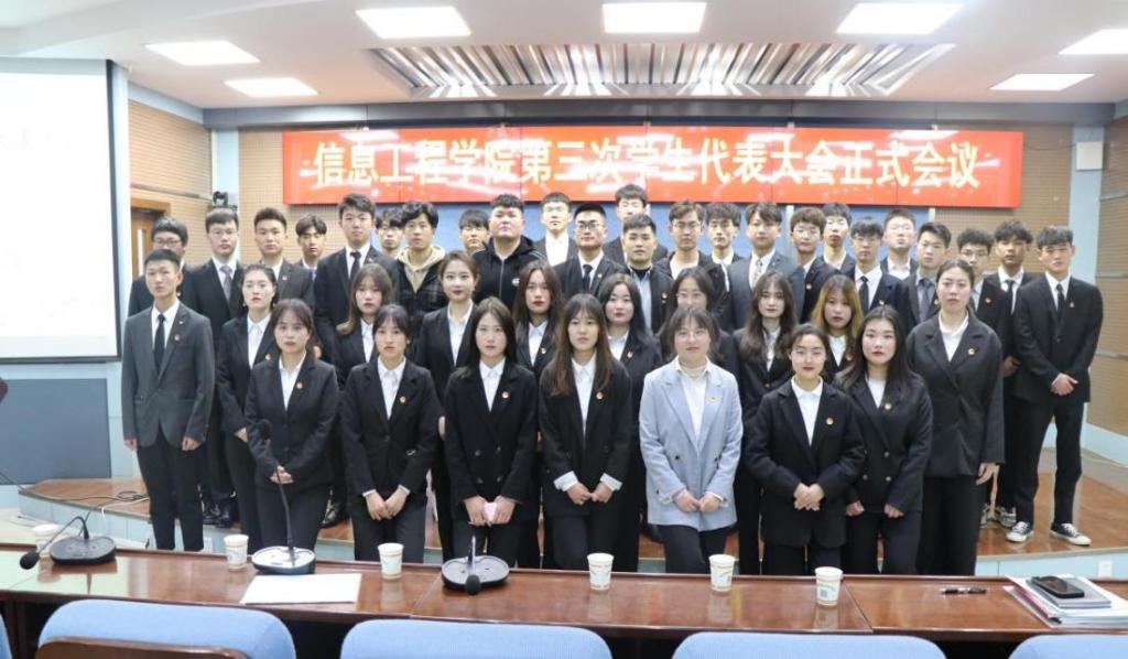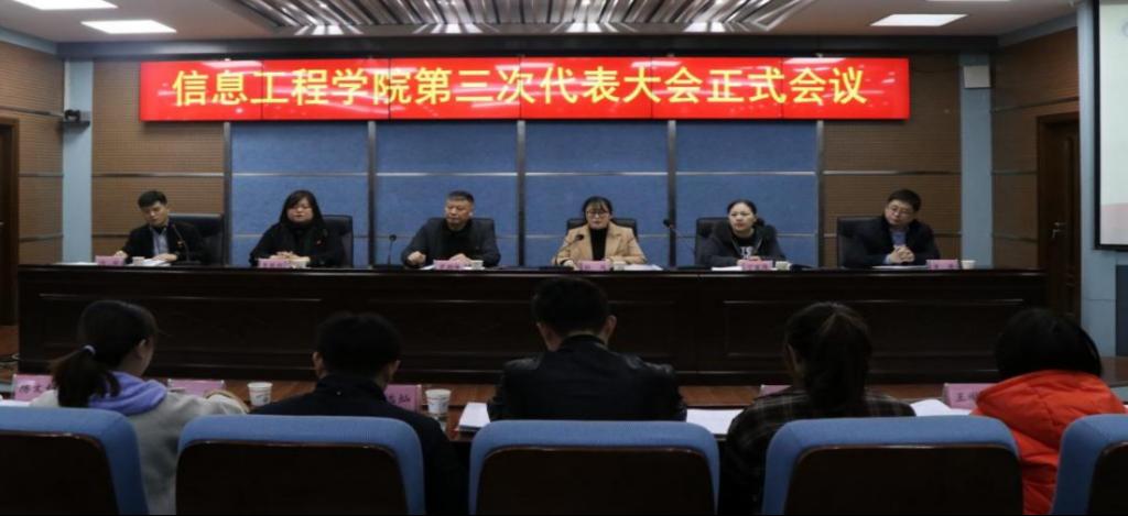4月3日,信息工程学院第三次学生代表大会于3号实训楼水利报告厅隆重召开。校团委副书记耿风、信息工程学院党总支书记罗朝峰、院长丁爱萍、党总支副书记李晓娟、副院长曾赟、党总支分团委书记何昕、全体辅导员出席本次大会,学生会主席团代表,学生会干事以及140名学生代表参会。