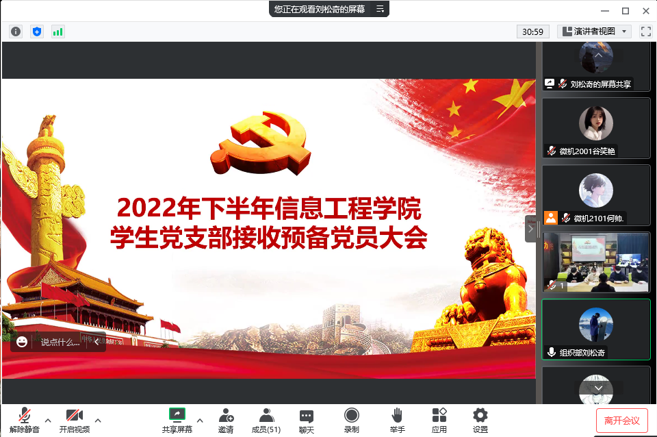 11月29日信息工程学院以线上线下相结合的形式在SY4409B1召开2022年下半年接收预备党员大会,会议由信息工程学院学生党支部书记何昕主持,支部全体党员参会。