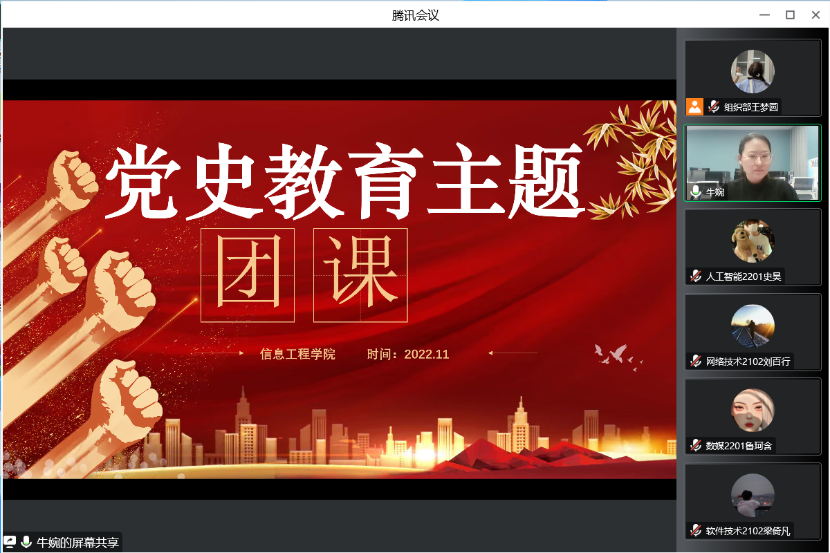 11月22日在线上开展“党史教育”主题团课。此次团课由信息工程学院牛婉老师组织,信息工程学院全体团校学员参加。
