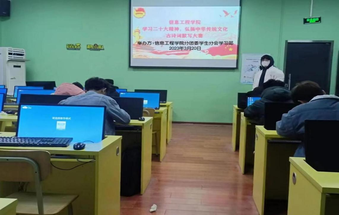 3月20日,信息工程学院在SY4405B3教室组织开展“学习二十大精神,弘扬中华传统文化”为主题的古诗词默写比赛。本次比赛内容分为两类:古诗文和同音字默写,共二十分。比赛开始时会给每个人分发纸质试卷,参赛人员拿到即可答题,比赛时间为二十分钟。本次活动在培育发展学生古诗词文化兴趣的同时也传承发扬了中华优秀古诗词文化。