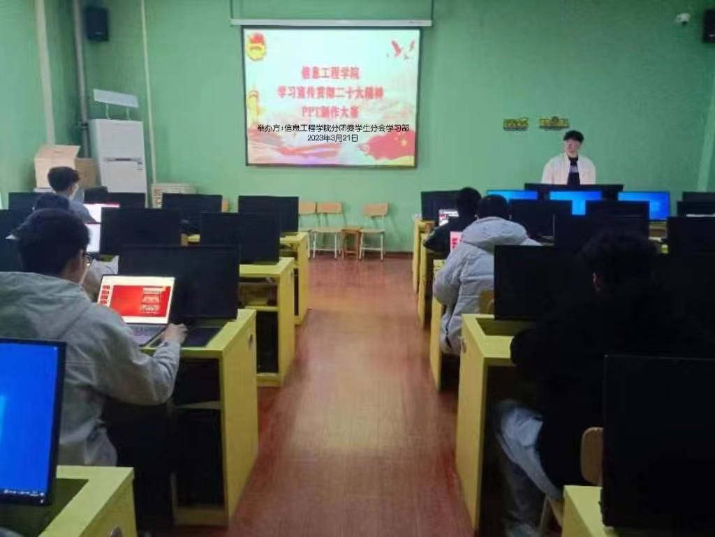 3月22日,信息工程学院在SY4405B2组织开展以“青春献礼二十大,强国有我新征程”为主题的PPT制作大赛。本次比赛需要参赛选手现场制作PPT,一小时为限,将严格遵守公平、公正、公开的原则。本次PPT制作比赛不仅能加强学生们对二十大精神的深刻理解,还能锻炼学生们的PPT制作能力和动手实践能力,提高学生对网络的兴趣和自主应用的积极性,丰富学生们的在校生活。
