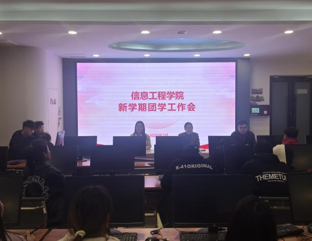 2月28日,信息工程学院在四号实训楼4405C召开新学期团学工作会,学院党总支副书记武琳琳、总支办主任韩欢乐、分团委书记李翔以及辅导员老师、全体学生干部参加本次会议。武书记深刻总结2024年团学工作亮点与不足,并传达2025年团省委工作要点、校团委工作计划,围绕思想政治引领、党建带团建、学风建设等任务,对新学期我院重点推进工作进行全面部署,要求团学各部门强化思想政治定位,提升工作能力素质,着力做好校庆主题与校园文化特色活动,提升科技创新实践活动育人实效,以严谨务实的作风与创新进取的行动把稳团学工作基本盘,通力合作、迎难而上,推动我院新学期团学工作取得优异成绩。