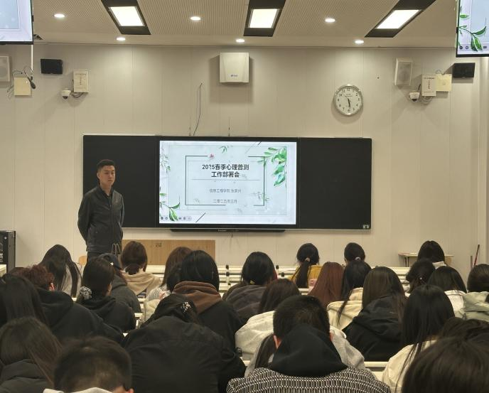 3月13日,信息工程学院辅导员张家兴在5号教学楼5210组织召开春季心理普测工作部署会。宣讲过程中,张老师讲解了心理健康普测工作的重要性和紧迫性,重点回应学生对普测存在的困惑,详细介绍了心理普测的操作流程及注意事项,鼓励同学们在填写问卷时秉持真实客观的原则,遵从内心,诚实地反映自己的心理状况。