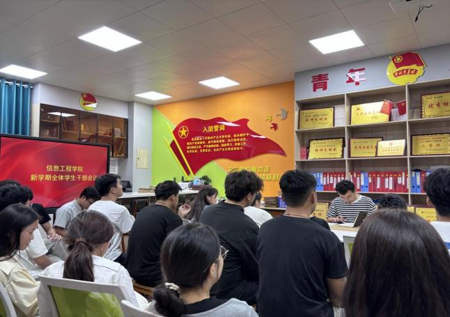 8月31日,信息工程学院学工办主任李翔,在SY4405C主持召开新学期班长、团支书及学生会骨干成员专题会议,对新学期学生工作作出具体部署与要求。会议伊始,李翔老师强调学生骨干需“主动亮身份,明确责任担当”。他指出,骨干成员在日常学习生活中,尤其是在课堂垃圾清理等公共场景中,要清晰认知自身身份,以行动树立榜样,带动班级及校园整体风气提升,将责任意识融入细节。参会骨干纷纷表示,将严格落实会议要求,以实际行动履行职责,为班级和学校发展贡献力量。