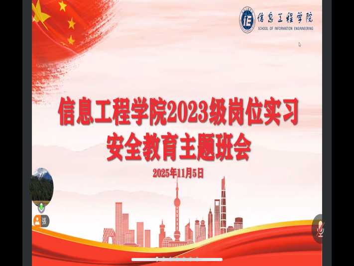 11月5日,信息工程学院辅导员张家兴在线上组织召开2023级岗位实习安全教育主题班会。班会上,张老师结合丰富的实际案例,围绕人身财产安全、交通安全、消防安全、网络安全等多个方面展开了细致入微地讲解。在人身财产安全方面,着重提醒学生提高自我保护意识,避免夜间独自外出,妥善保管个人财物,警惕各类诈骗行为;针对交通安全,强调要严格遵守交通规则,乘坐正规交通工具,杜绝酒后驾车、疲劳驾驶等危险行为;在消防安全教育中,详细介绍了火灾预防、逃生自救等知识,让学生掌握基本的消防技能。