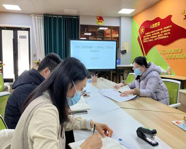 11月26日,信息工程学院于4号实训楼4409B1召开辅导员工作例会,党总支副书记武琳琳主持,全体辅导员参会。会议安排落实近期重点任务:一是及时整理心理工作材料及安全会议相关材料,确保内容完整、归档规范。二是组织完成对班长、团支书、宿舍长、心理委员等网格节点人员的工作职责说明,确保责任到人、落实到位。三是积极动员学生参与学院宿舍文化建设活动,重点围绕宿舍安全与环境提升开展工作。