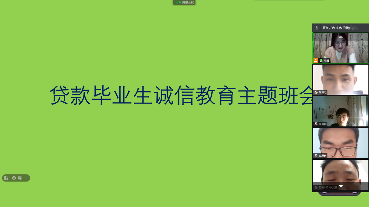 为了认真做好毕业生生源地贷款还款工作,进一步加强贷款学生的诚信意识教育,信息工程学院于5月10日以线上形式开展“贷款毕业生诚信教育主题班会”,18级辅导员牛婉、李苗老师,18级全体贷款毕业生参加会议。