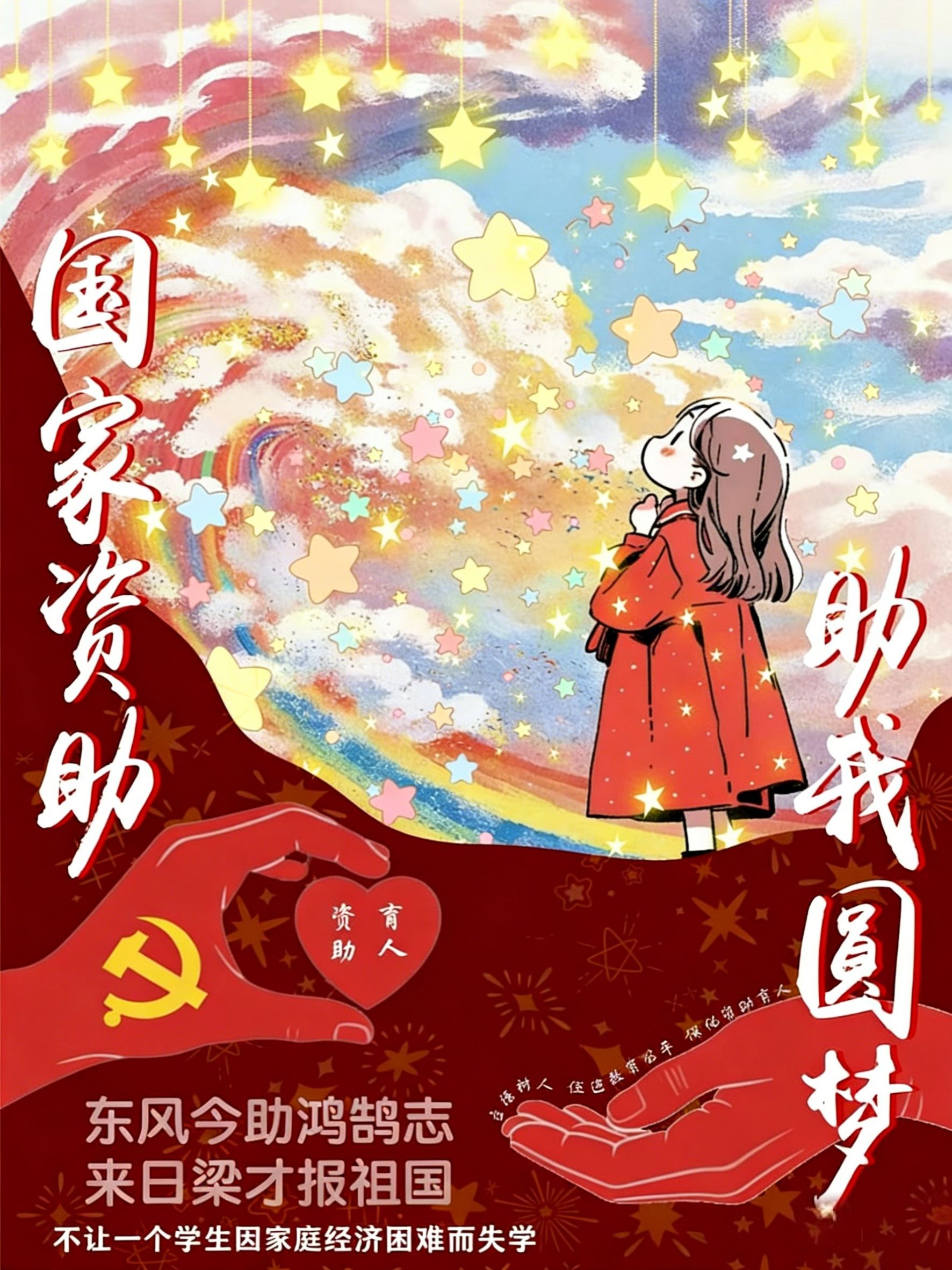参赛作品在准确传达政策信息的基础上,兼具创意与温度。经评审团从“政策精准度”“创意表现力”和“情感共鸣力”等维度综合评定,一批优秀作品脱颖而出。数媒AIGC2401班朱川川同学的作品《国家资助 助我圆梦》以暖红色为主调,融入星空与党徽元素,塑造出学子仰望希望的视觉形象,并配以“东风今助鸿鹄志,来日梁才报祖国”的标语,生动诠释了“资助育人”的价值内涵。