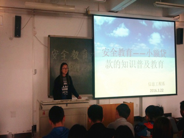 为引导学生提高个人信息保护意识,理性消费、正确对待小额贷款,我系于3月22日16:20时,分别在JX2202、JX2203教室召开了安全教育暨正确对待大学校园小额贷款主题班会。会议分别由14级辅导员张瑞青和15级辅导员蒋晓絮主持,14级和15级全体学生参加了此次会议。