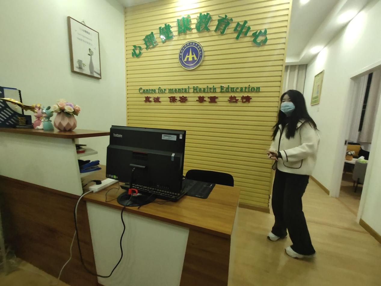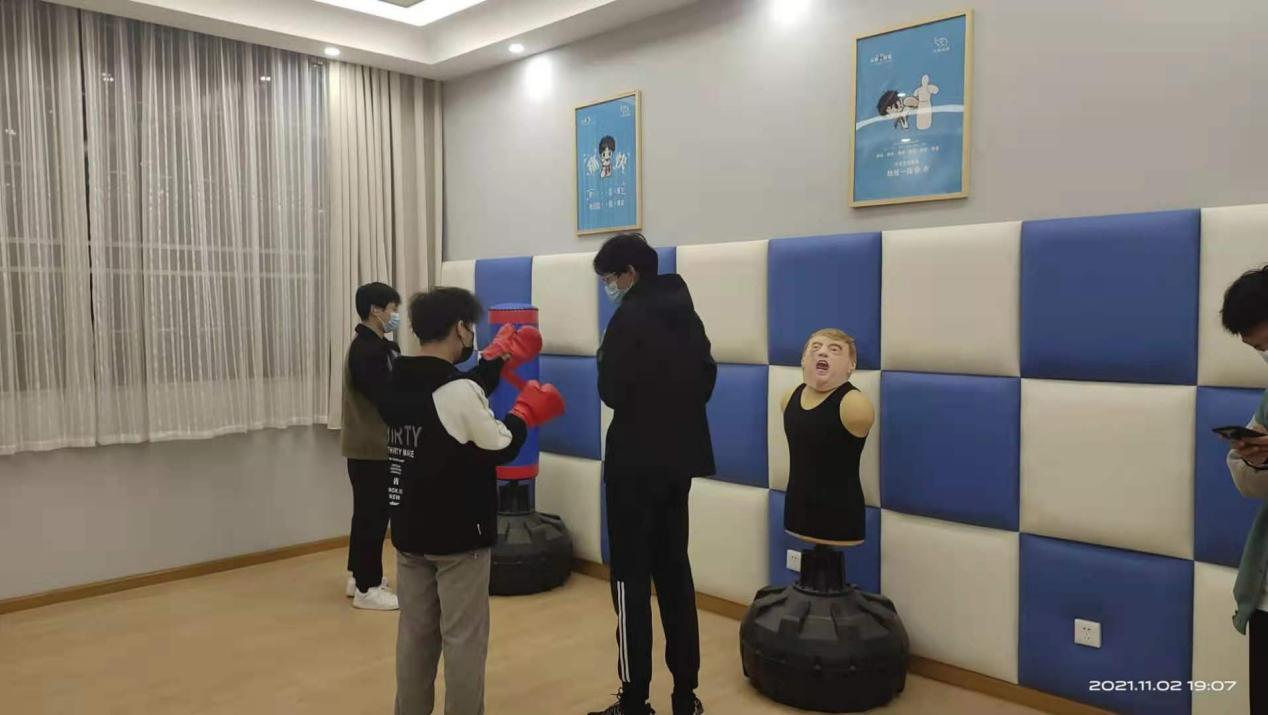 在心理咨询室里,值班的工作人员带领同学们参观接待室以及心理活动室,还参观了解压室,并为同学们示范如何使用解压室中的各种器械,帮助同学们释放压力。为同学们展示沙盘演示,介绍功能。最后,值班的工作人员指导大家如何预约心理老师,向同学们推荐我校阳光心苑微信公众号,请同学们关注公众号推送的心理健康知识和优秀的学生作品。