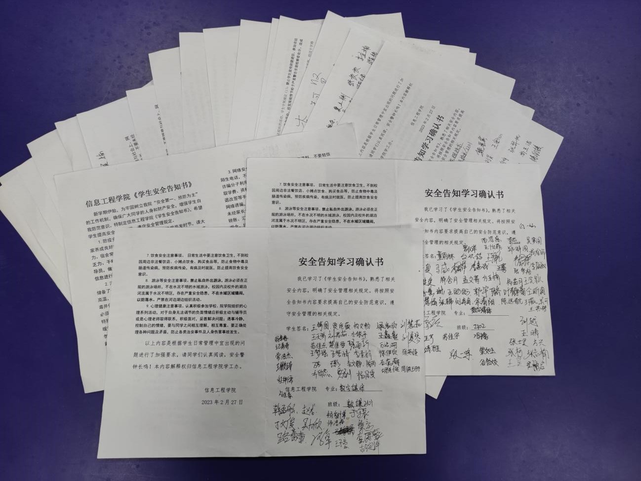 为切实保证安全提醒传达到位,信息工程学院每月组织全体在校学生签订安全告知书。使学院对学生的校园安全提醒常抓不懈。